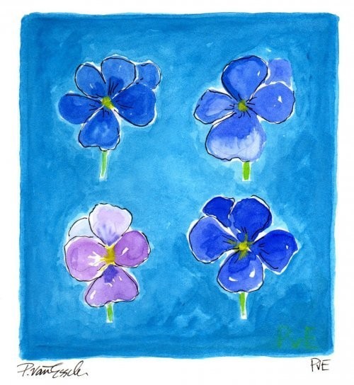 One of my favorite blossoms in early Spring are "Johnny-jump-ups" or known as Viola's and grow in the cold and rain. Did you know that they are edible and lovely in salads. I painted this little work of art as a reminder to blossom and to jump up each day and keep going strong. Paul's has so many beautiful blossoms to pick up and plant. How does your garden grow?