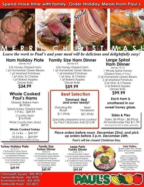 Did you know that Paul's does Holiday Dinners?  All you have to do is place your order on line or by phone.  What a gift to give or to receive during the busy holiday season.  So, leave the "cookin" to Paul's and order a meal to go.  Did you know that taking one thing off your list will actually give you more JOY!  Go on, try it and focus on the joy of this season, gathering with family and friends and sharing a dinner. Ring that dinner bell and honor the Holidays with a family meal from Paul's Fruit Market.