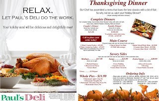 Okay, so time is going SO fast. Or is it that I am getting older and my perception has changed? At any rate, Thanksgiving is almost upon us. Did you know you can get your dinner from us? Take a look. I would tell you about it, but it's just too much. There is something for everyone. The deadline is Monday, November 19th at 5:00pm. Relax, let Paul's do the work for you!